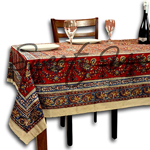indiamart Homestead Cotton Vegetable Dye Hand Block Print Tablecloth for Rectangle Tables 70x104 inches Blue Black Beige (Red, 88 x 104 inches)